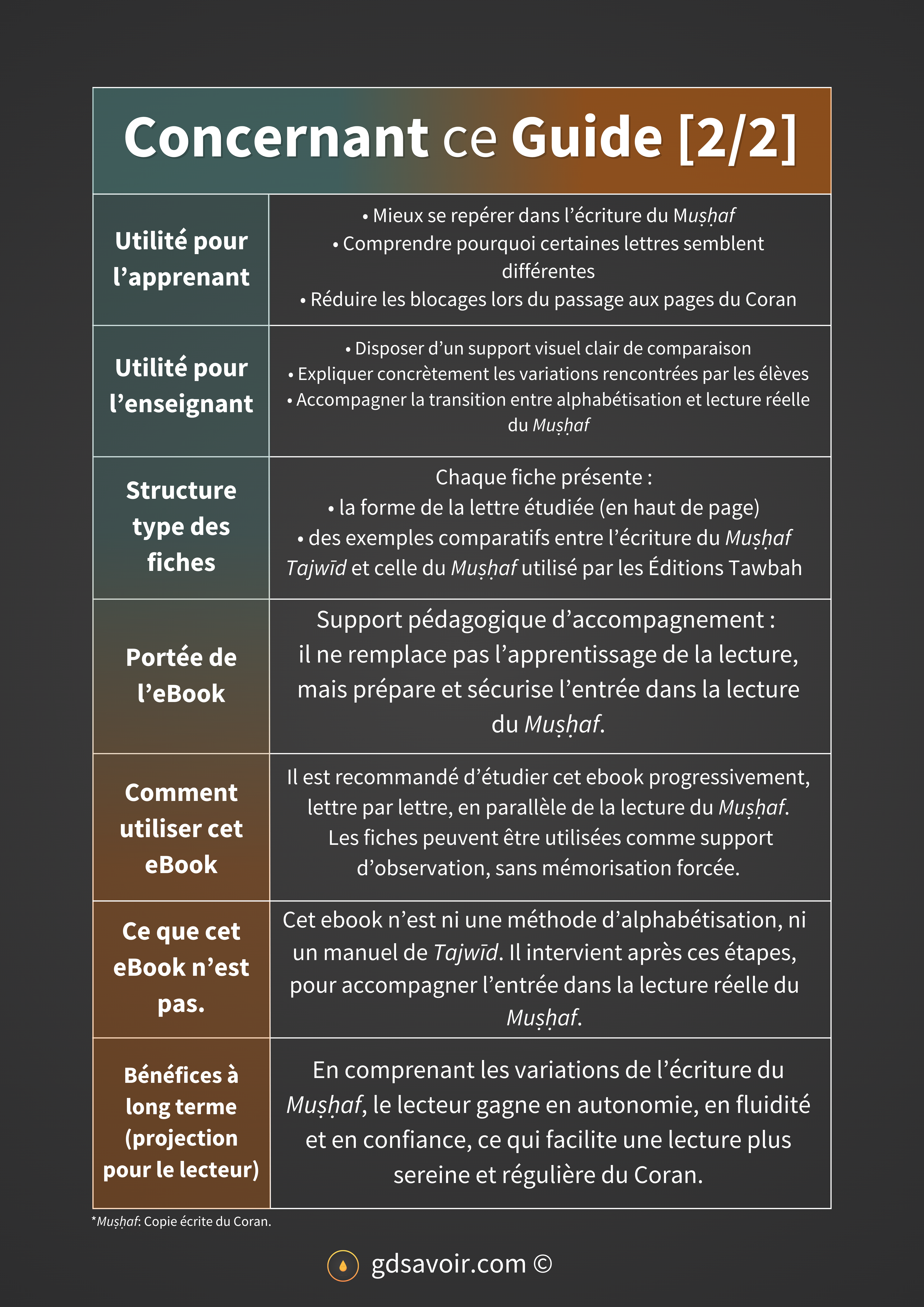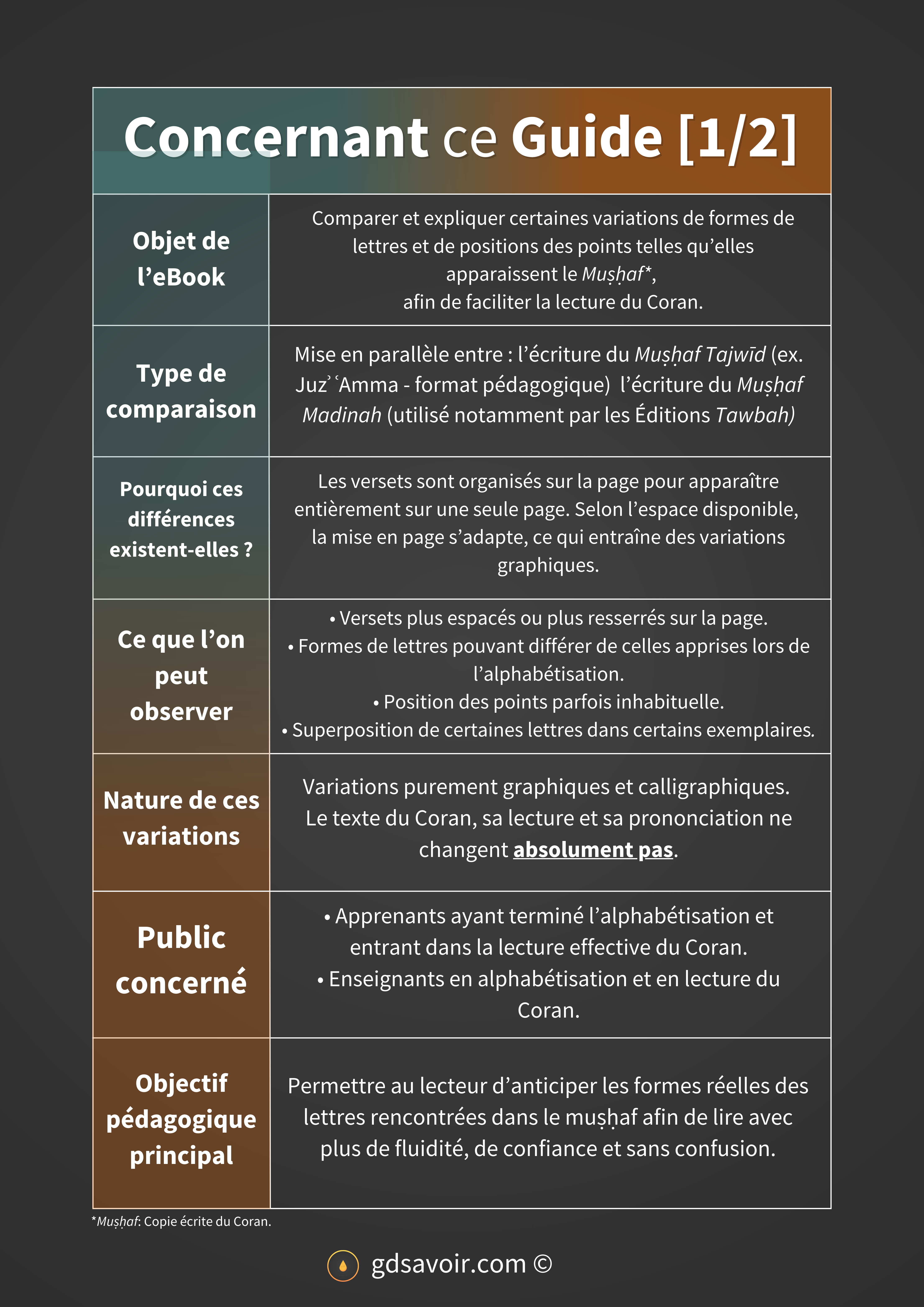 Ce guide a été conçu pour permettre de comprendre rapidement, en un seul coup d’œil, certaines particularités de l’écriture du mus-haf qui peuvent surprendre lors de l’entrée dans la lecture du Coran. Grâce à des comparaisons visuelles claires, il facilite la transition entre l’alphabétisation et la lecture effective du Coran, aussi bien pour les apprenants que pour les enseignants qui les accompagnent.